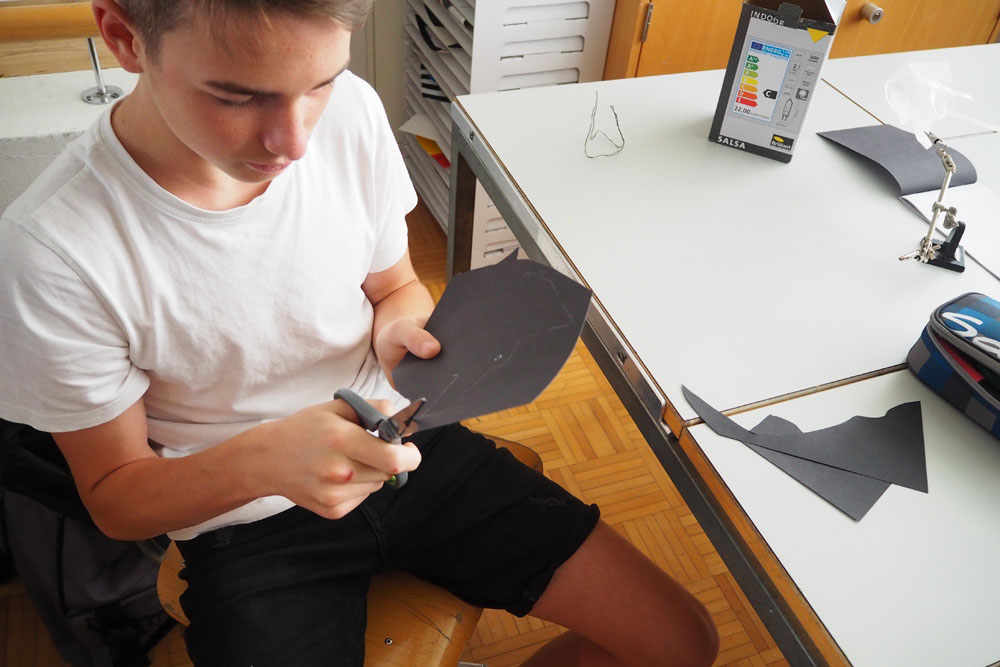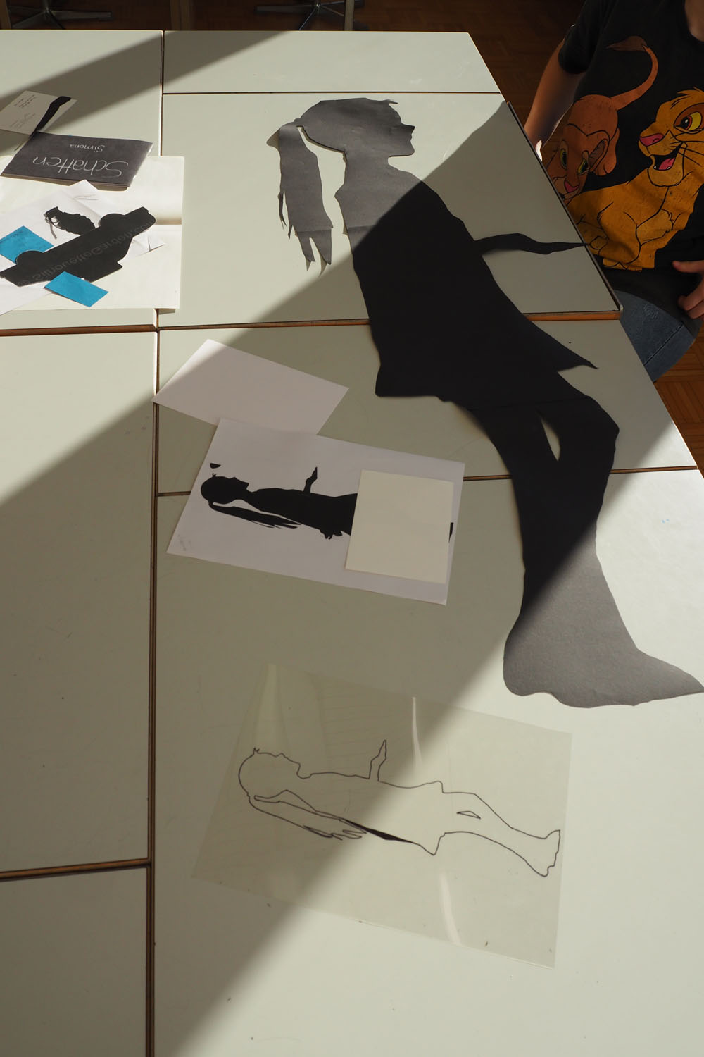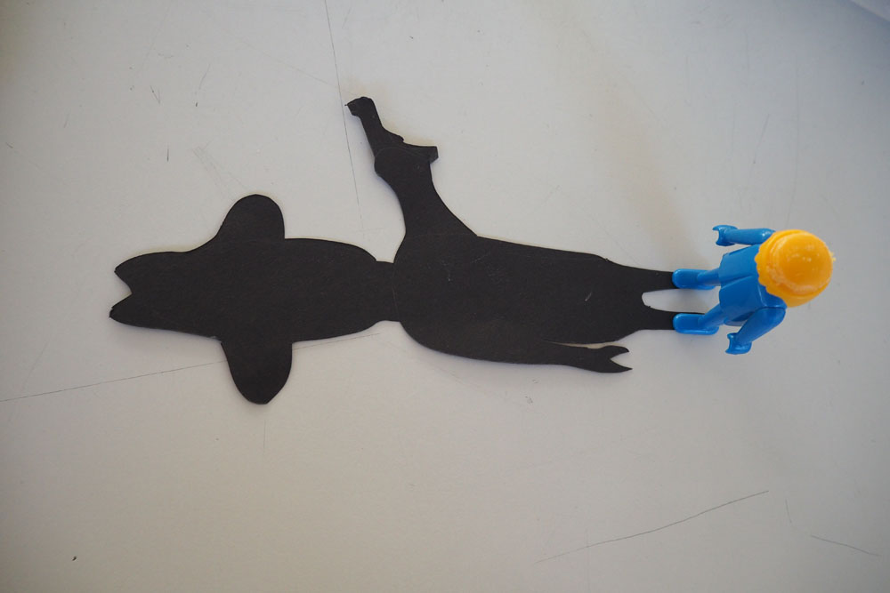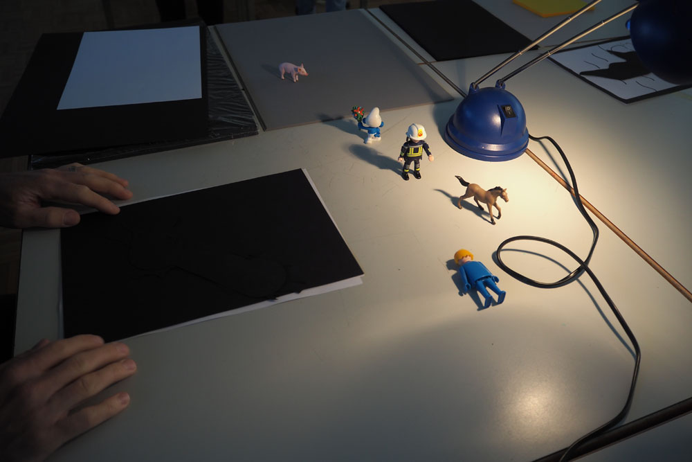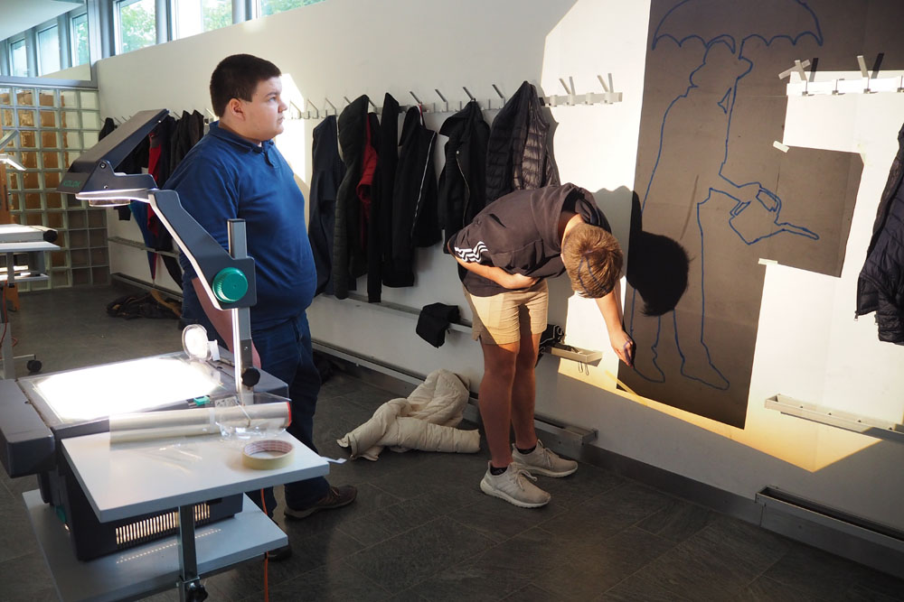 En s’appropriant l’espace, les élèves s’inscrivent à leur tour dans le mouvement du street art et de l’art de l’installation. À l’aide de différents matériaux et procédés, ils expérimentent les possibilités qu’offrent l’ombre et la lumière. Les silhouettes qui en résultent sont approfondies, transformées et détournées. Elles passent successivement de l’espace au plan, et vice-versa, ou apparaissent agrandies dans les espaces extérieurs de la classe. Ces silhouettes animent l’environnement de l’école, nous racontent une histoire ou nous transmettent un message. De nouvelles lectures de l’architecture quotidienne voient le jour et invitent à réfléchir à ce qui appartient l’espace commun.