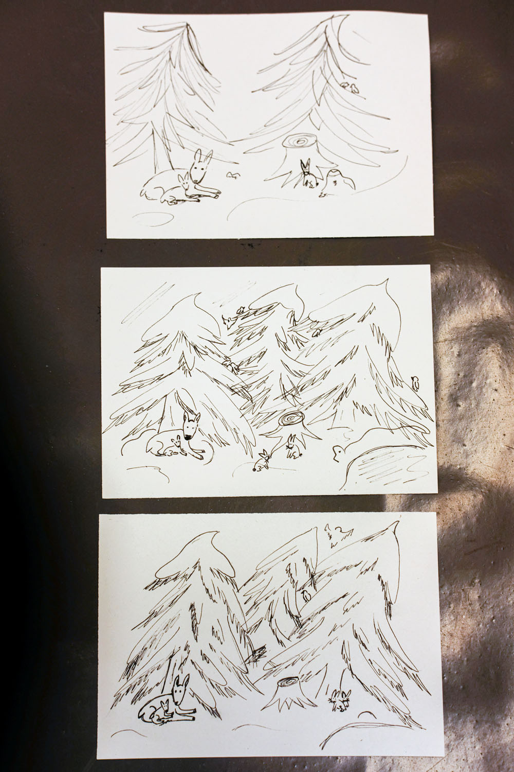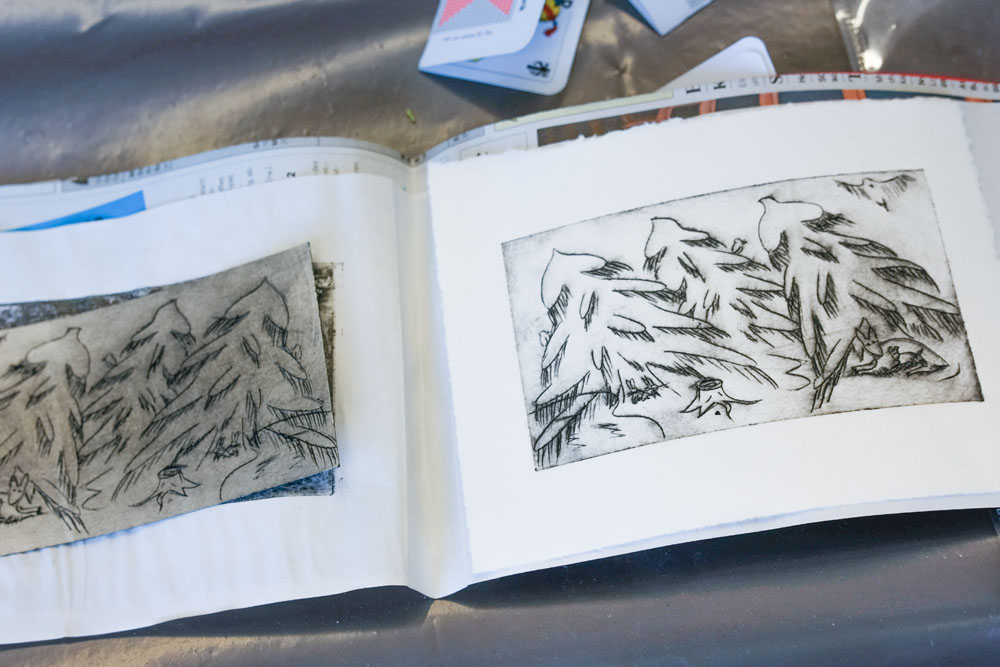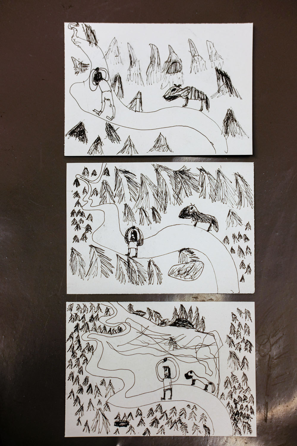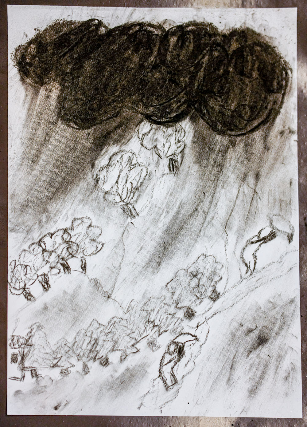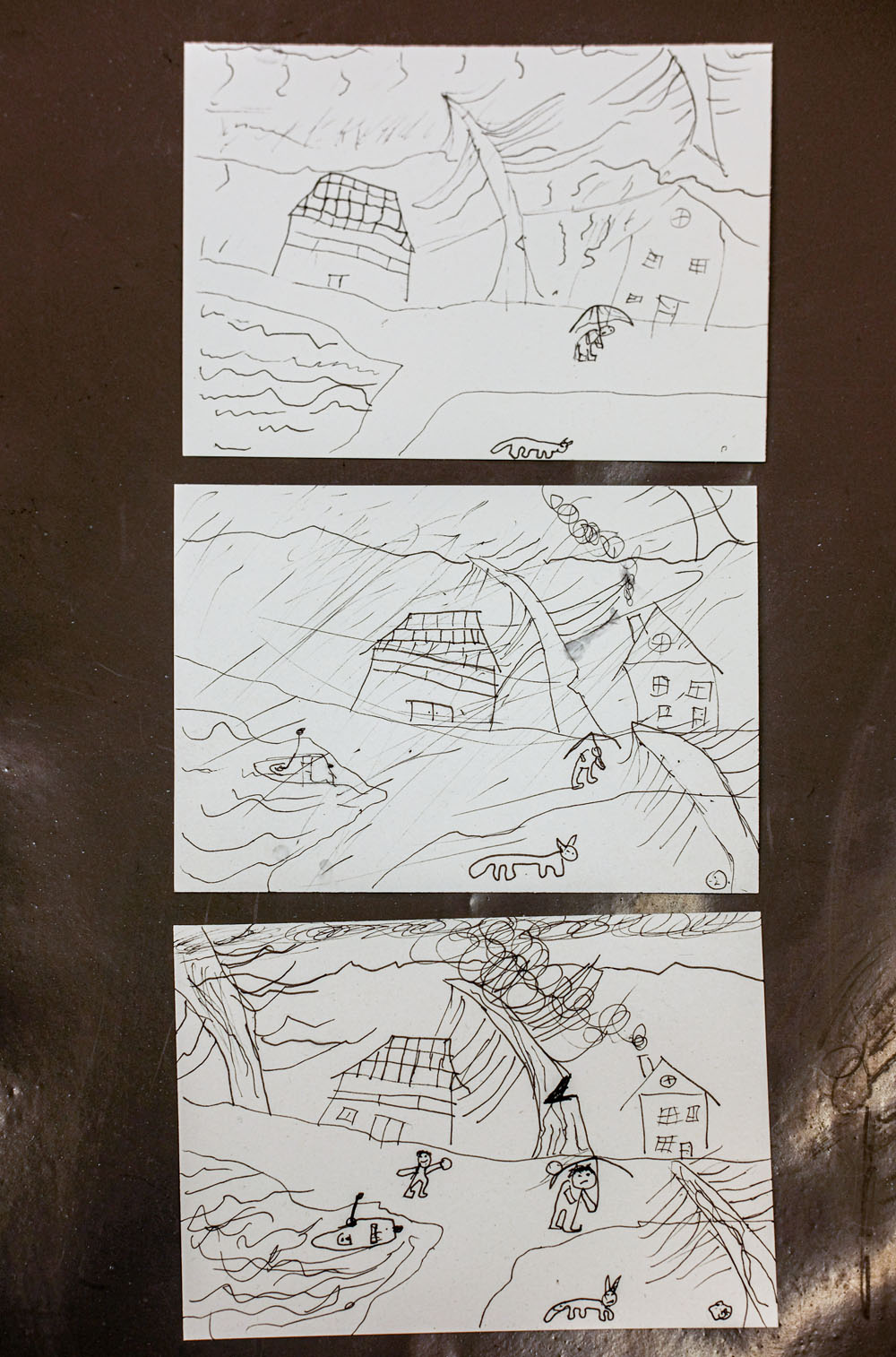 et les chapeaux s’envolent. Le paysage est en mouvement. C’est un excellent thème pour la gravure en creux sur du carton de brique de lait.
