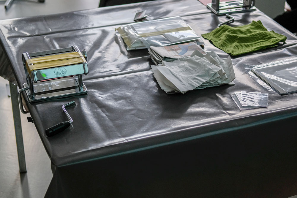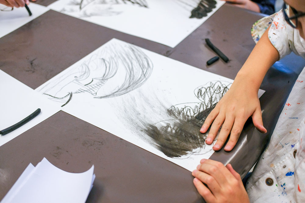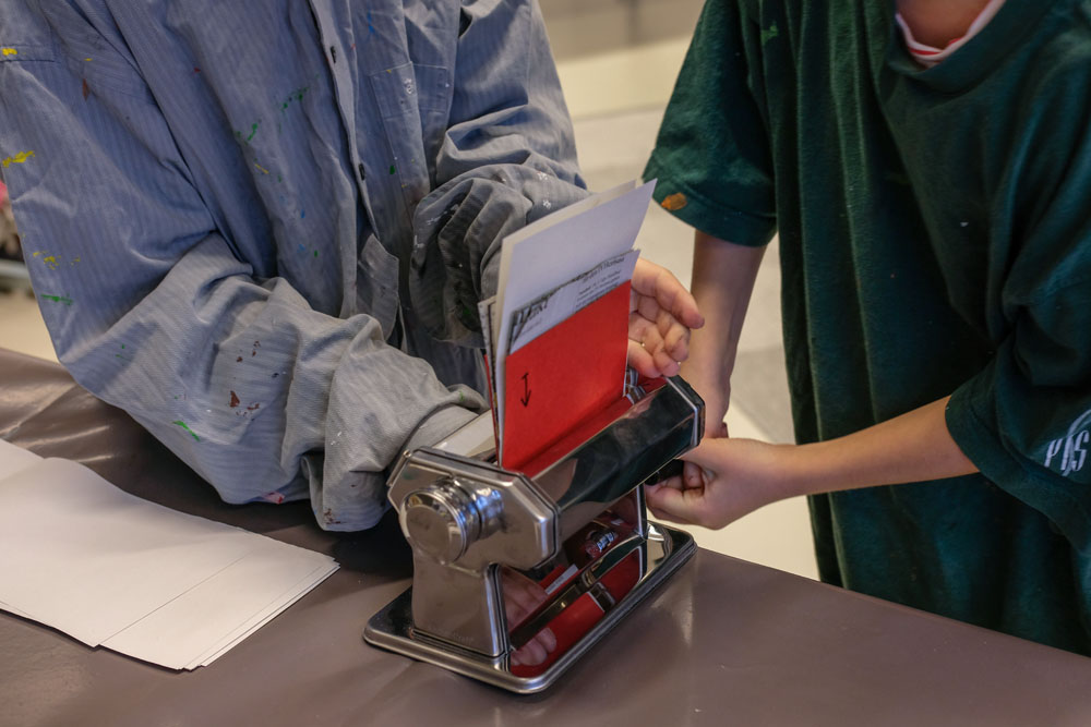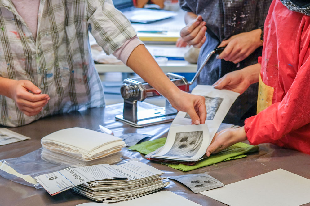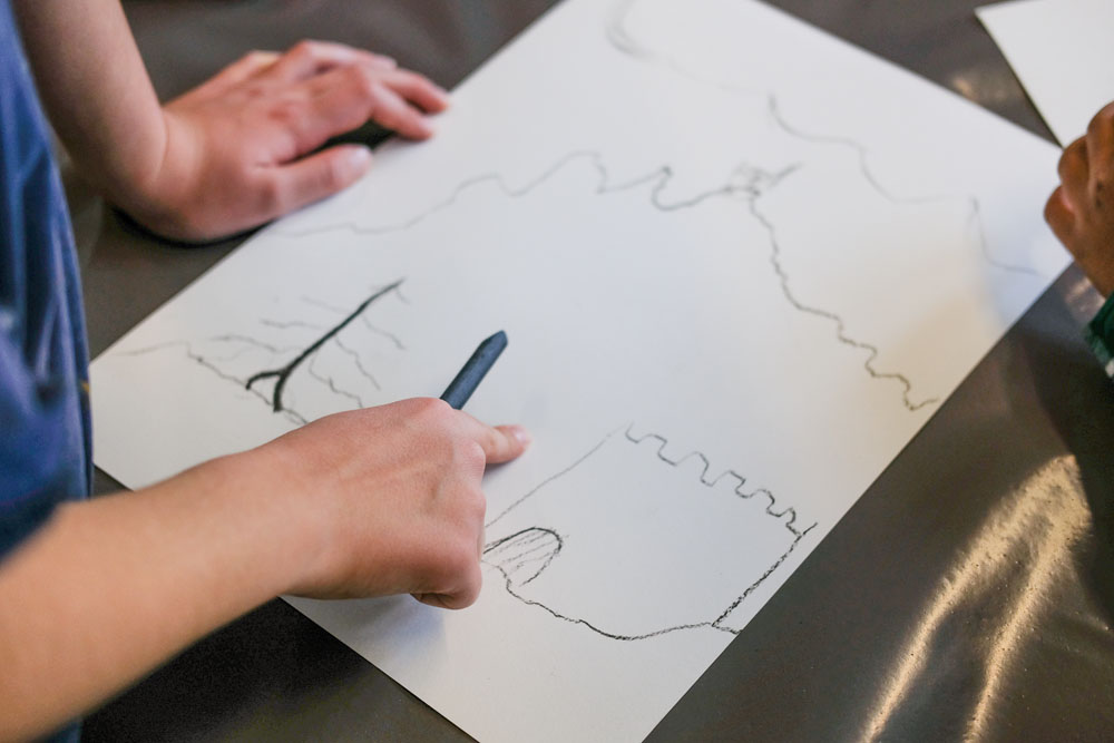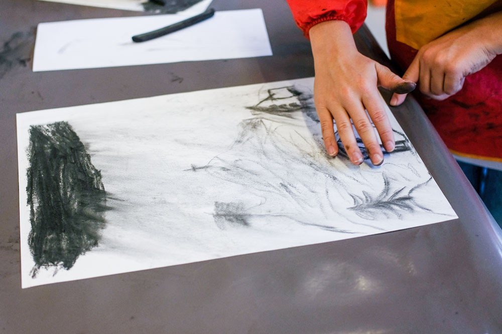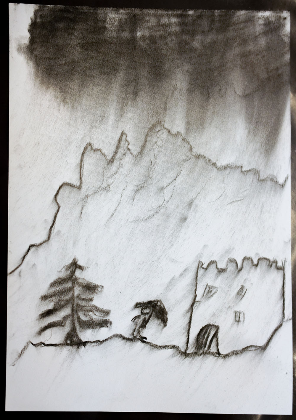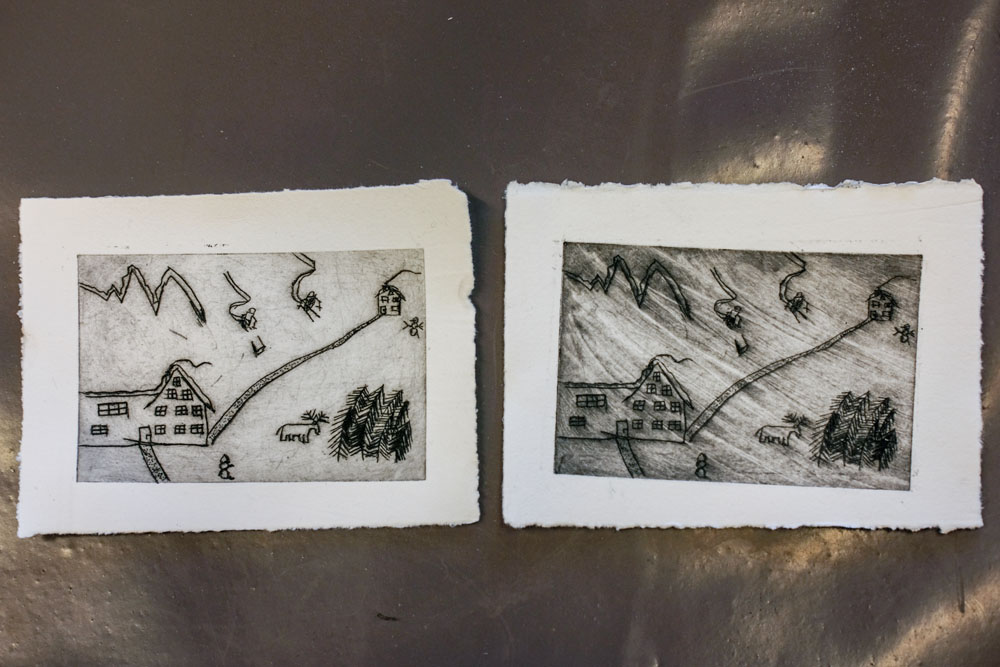 et les chapeaux s’envolent. Le paysage est en mouvement. C’est un excellent thème pour la gravure en creux sur du carton de brique de lait.
