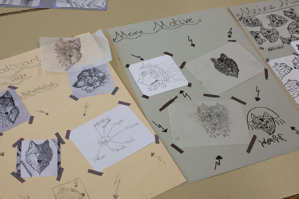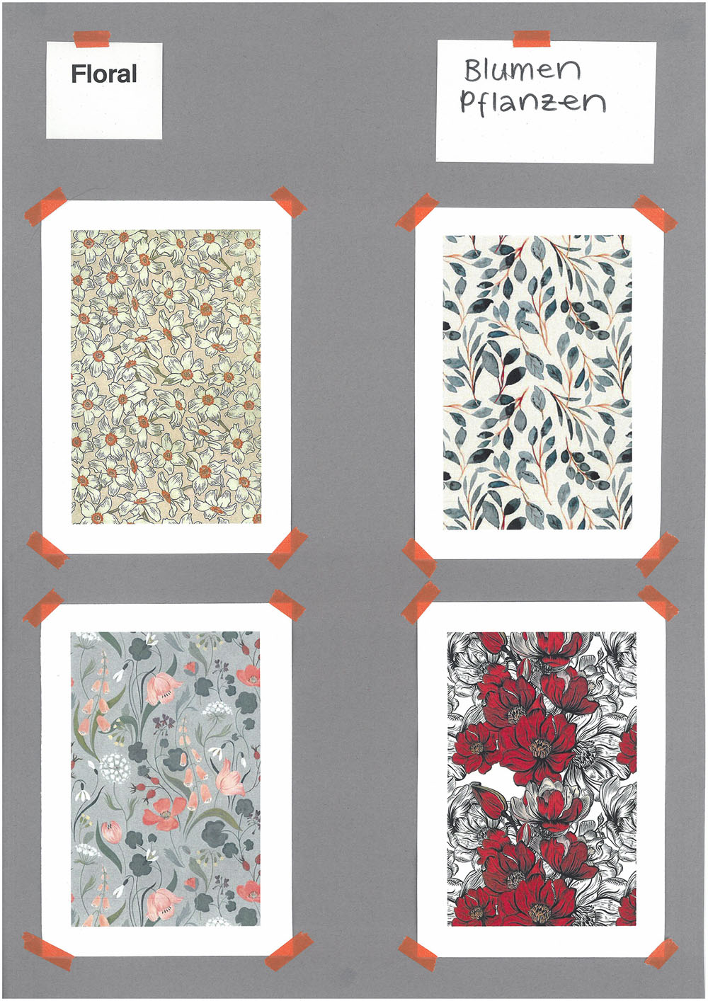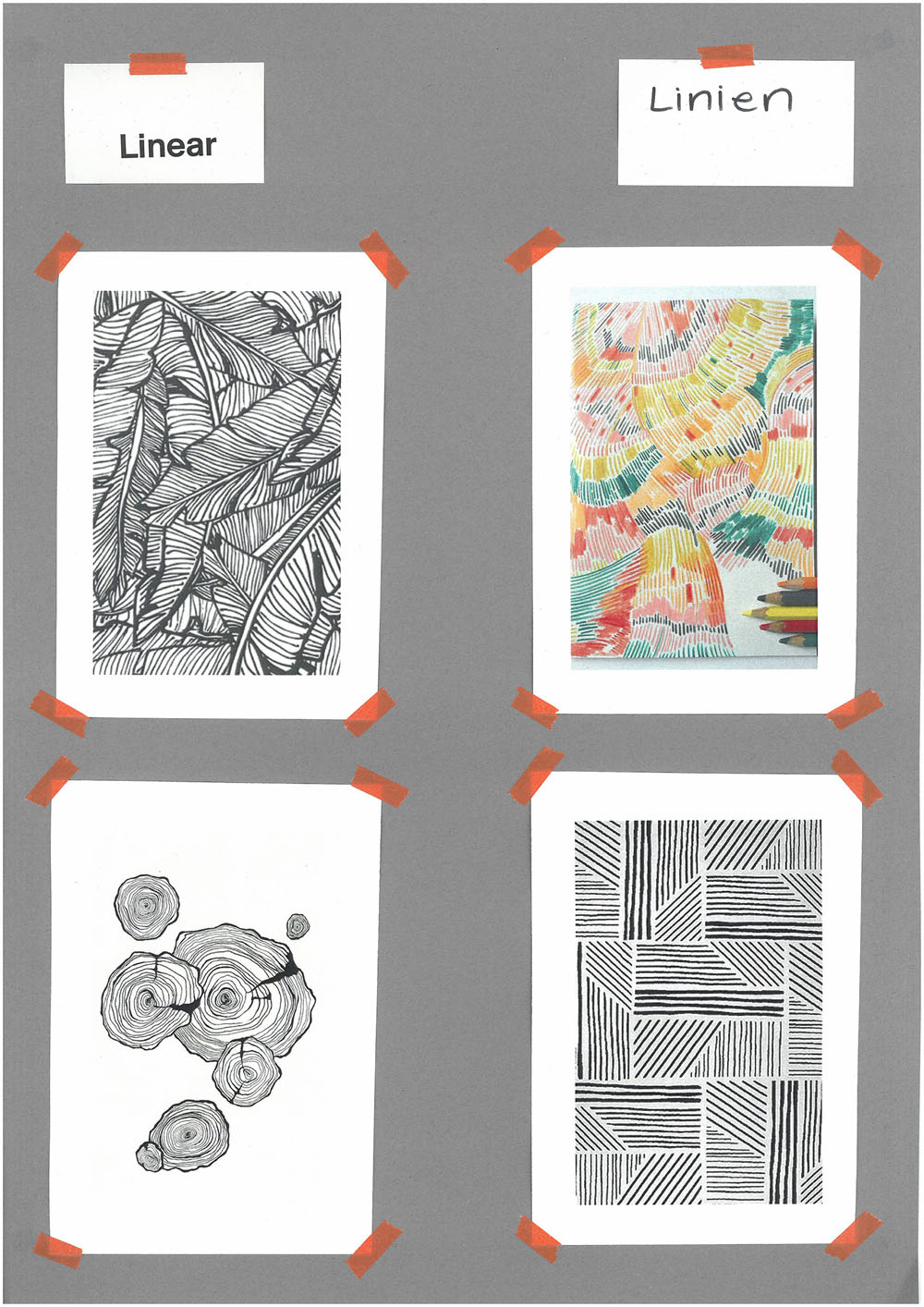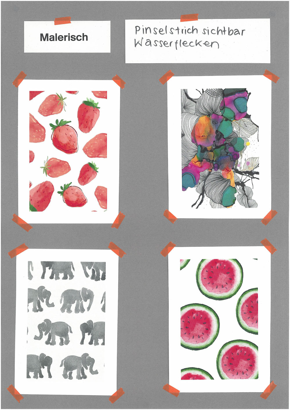 Partant de leurs propres intérêts, les élèves créent une planche d’inspiration (moodboard), dessinent des éléments graphiques et les réunissent dans une collection de motifs. Ils et elles se familiarisent avec le vocabulaire technique et les méthodes pour composer des motifs, et documentent leur processus de création. La séquence d’enseignement se concentre sur la découverte ludique d’éléments
