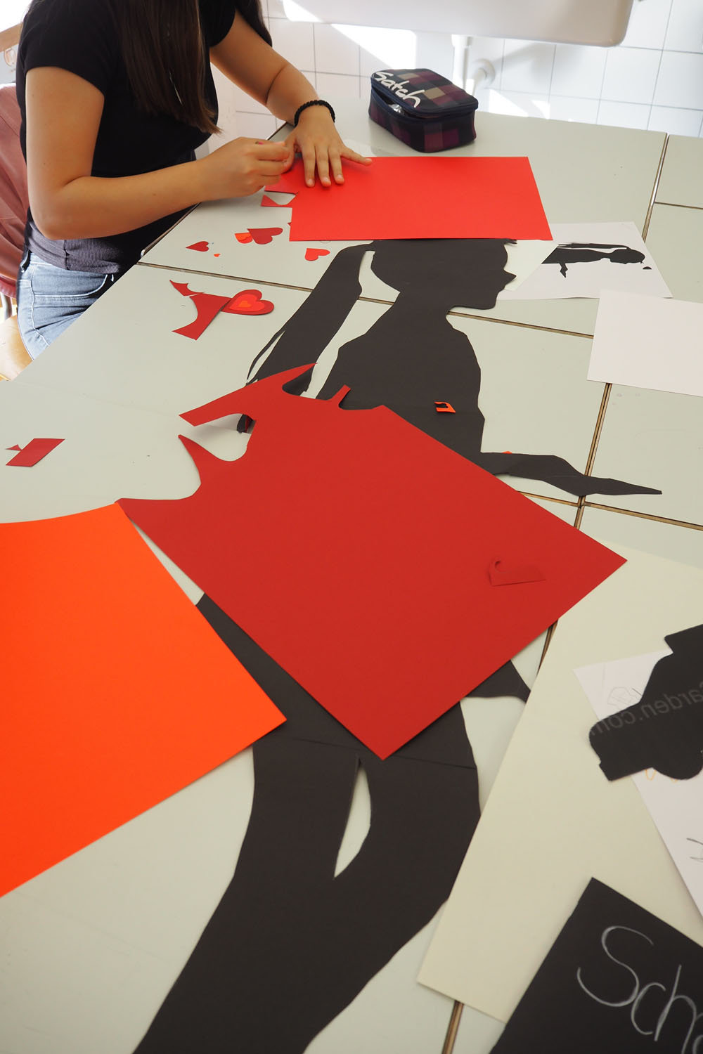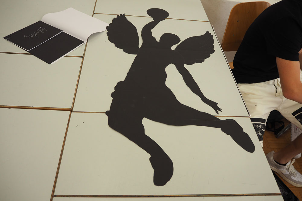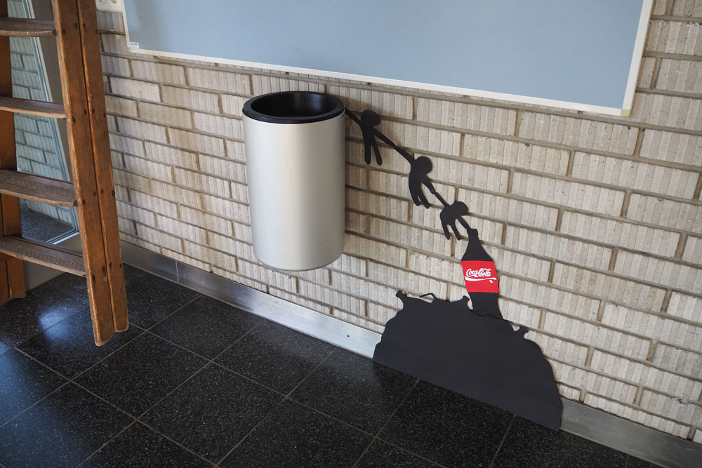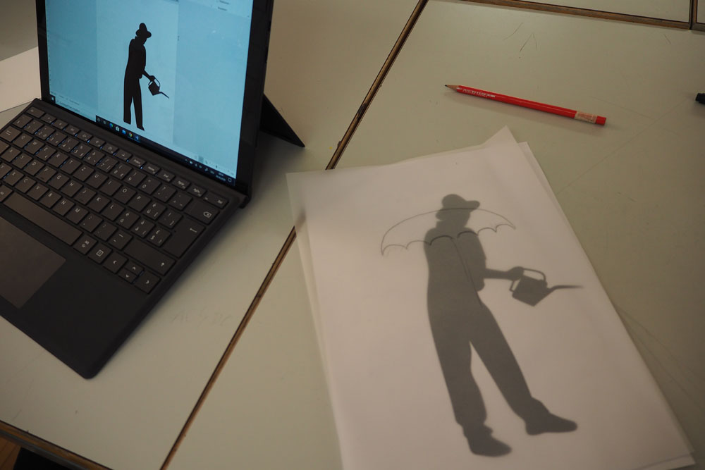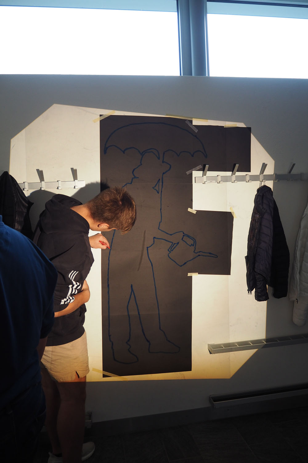 En s’appropriant l’espace, les élèves s’inscrivent à leur tour dans le mouvement du street art et de l’art de l’installation. À l’aide de différents matériaux et procédés, ils expérimentent les possibilités qu’offrent l’ombre et la lumière. Les silhouettes qui en résultent sont approfondies, transformées et détournées. Elles passent successivement de l’espace au plan, et vice-versa, ou apparaissent agrandies dans les espaces extérieurs de la classe. Ces silhouettes animent l’environnement de l’école, nous racontent une histoire ou nous transmettent un message. De nouvelles lectures de l’architecture quotidienne voient le jour et invitent à réfléchir à ce qui appartient l’espace commun.