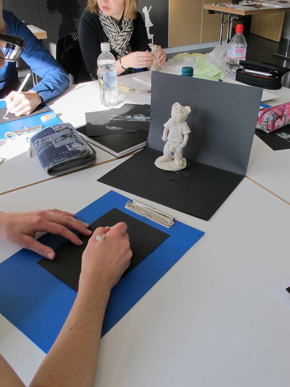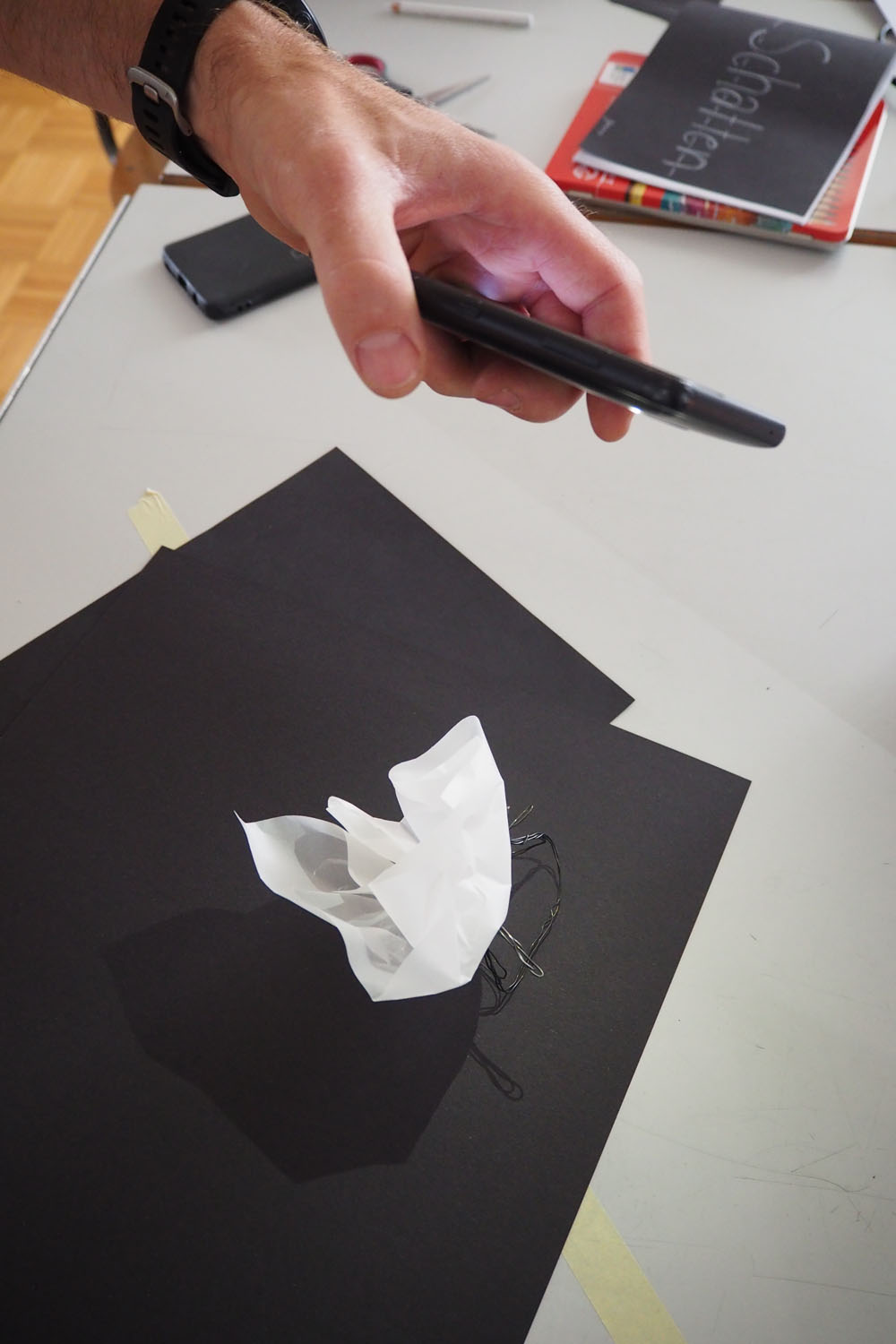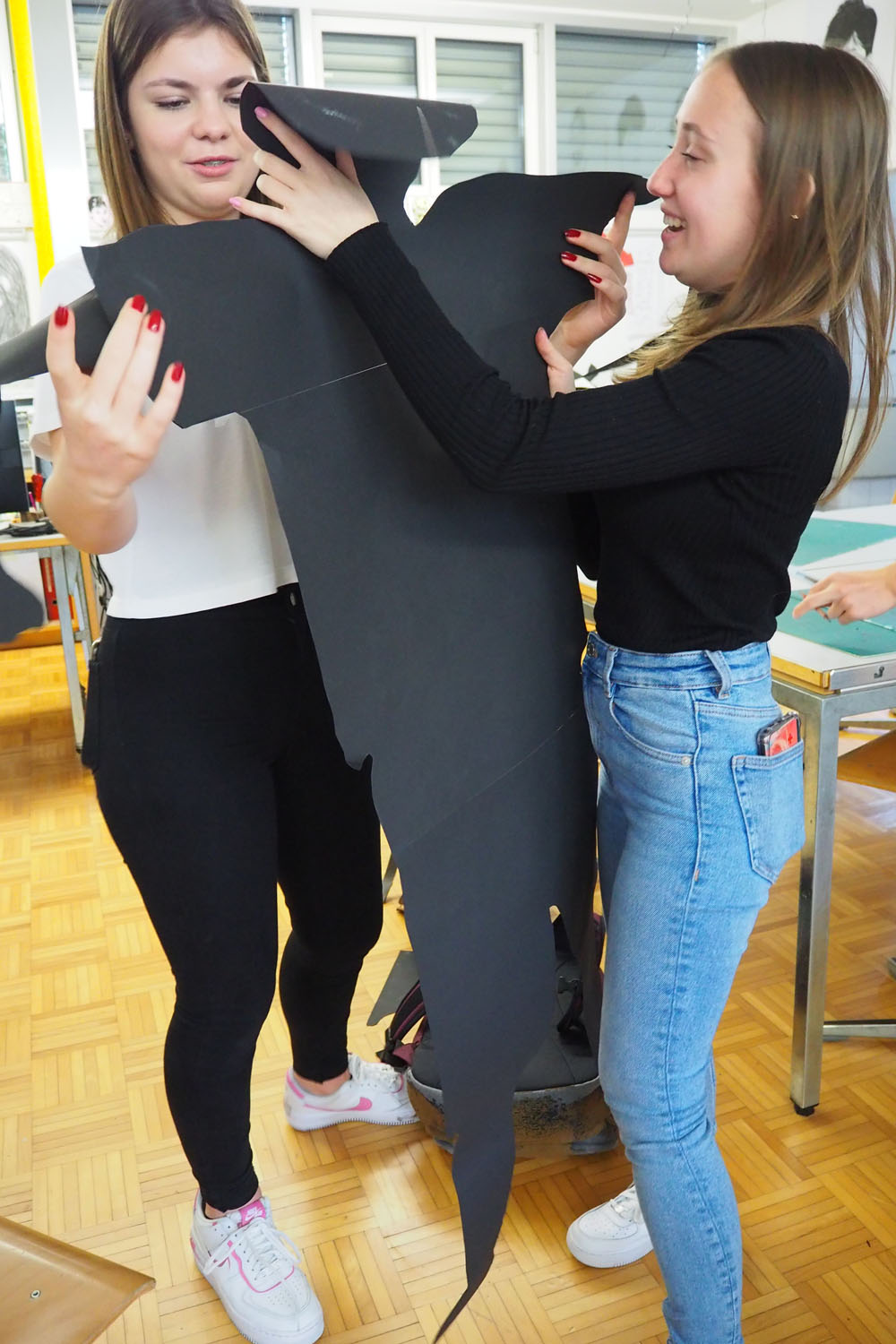 En s’appropriant l’espace, les élèves s’inscrivent à leur tour dans le mouvement du street art et de l’art de l’installation. À l’aide de différents matériaux et procédés, ils expérimentent les possibilités qu’offrent l’ombre et la lumière. Les silhouettes qui en résultent sont approfondies, transformées et détournées. Elles passent successivement de l’espace au plan, et vice-versa, ou apparaissent agrandies dans les espaces extérieurs de la classe. Ces silhouettes animent l’environnement de l’école, nous racontent une histoire ou nous transmettent un message. De nouvelles lectures de l’architecture quotidienne voient le jour et invitent à réfléchir à ce qui appartient l’espace commun.