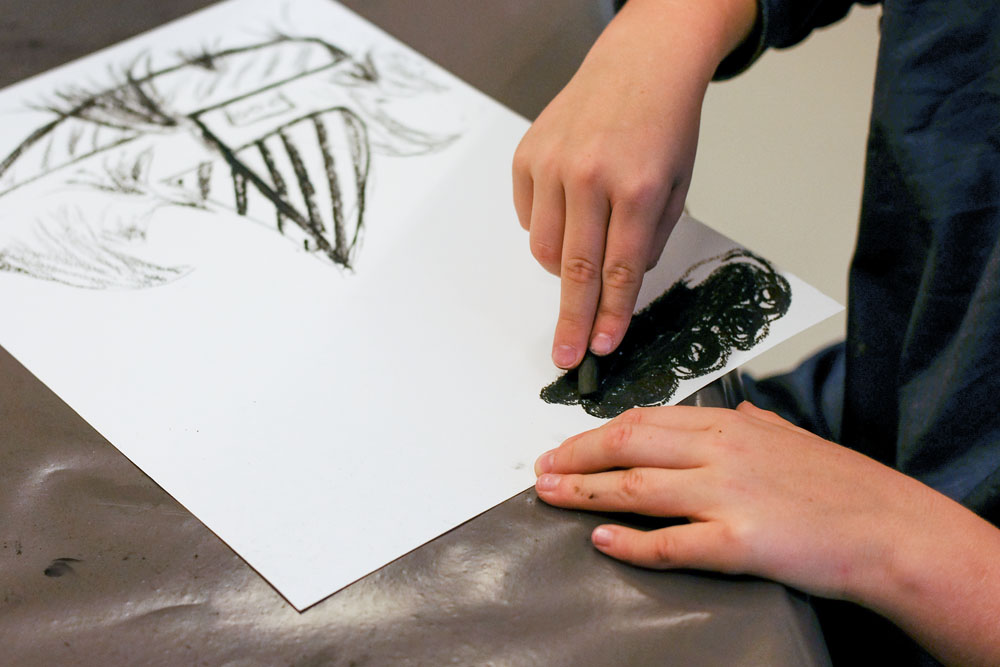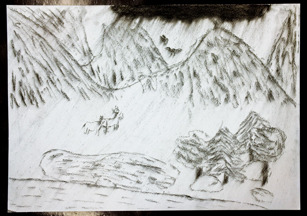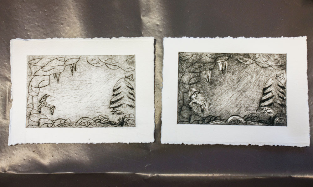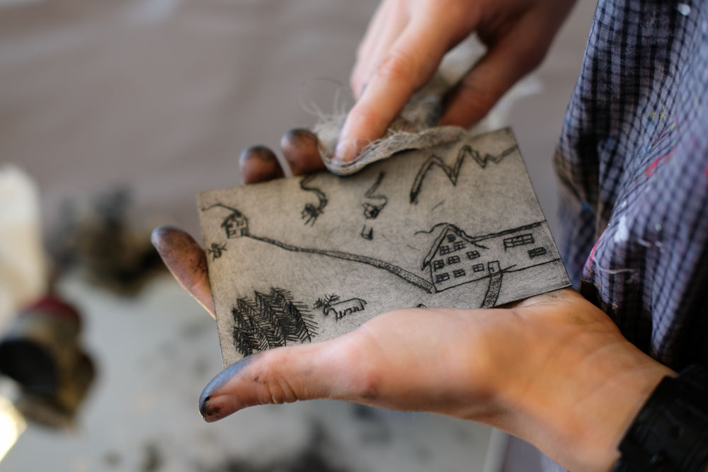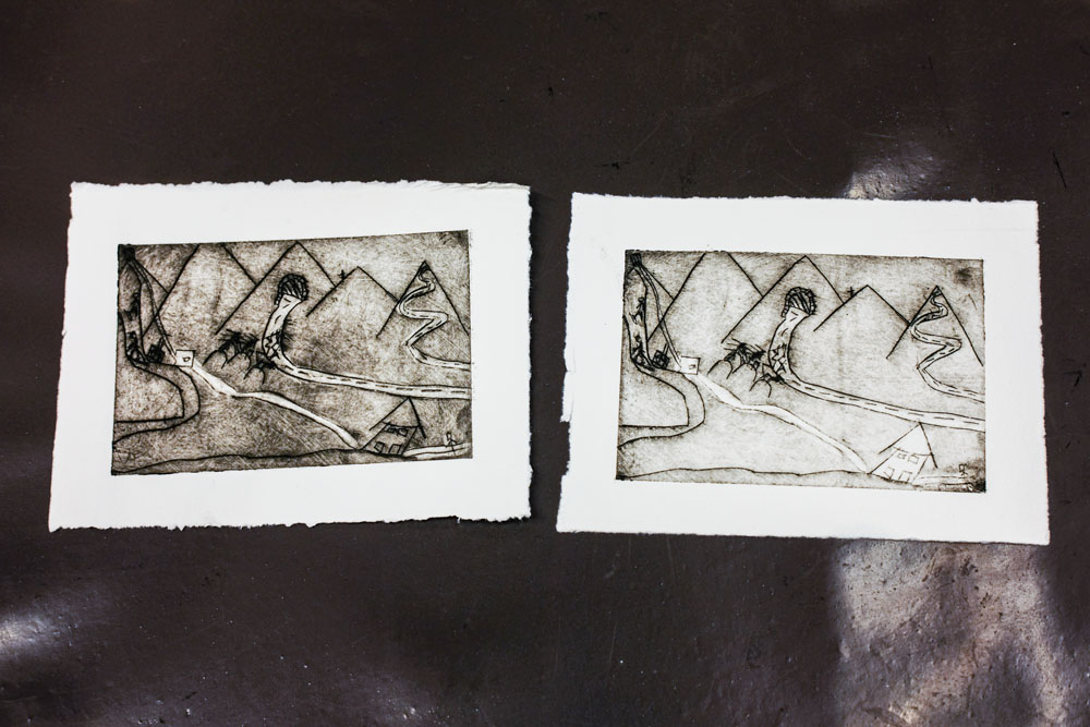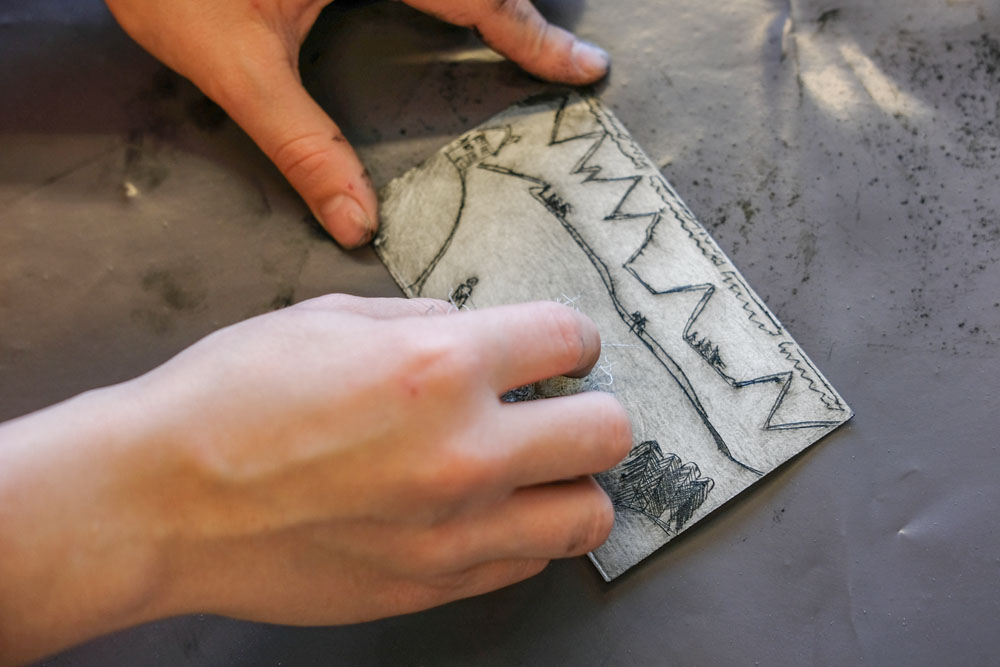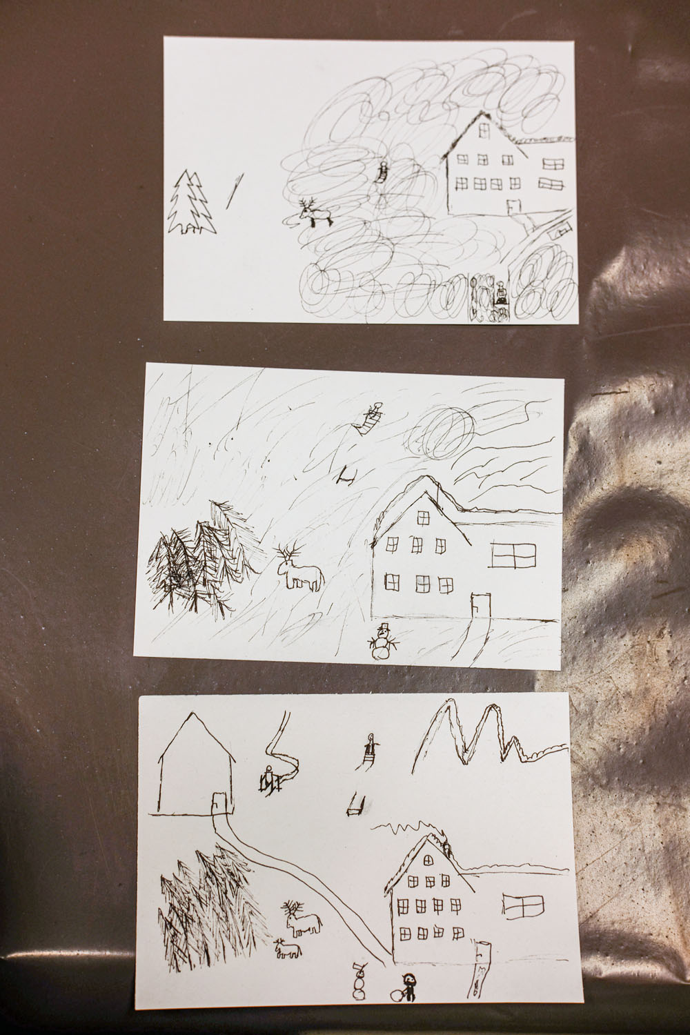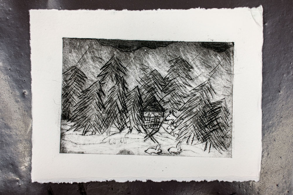 et les chapeaux s’envolent. Le paysage est en mouvement. C’est un excellent thème pour la gravure en creux sur du carton de brique de lait.