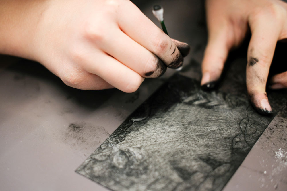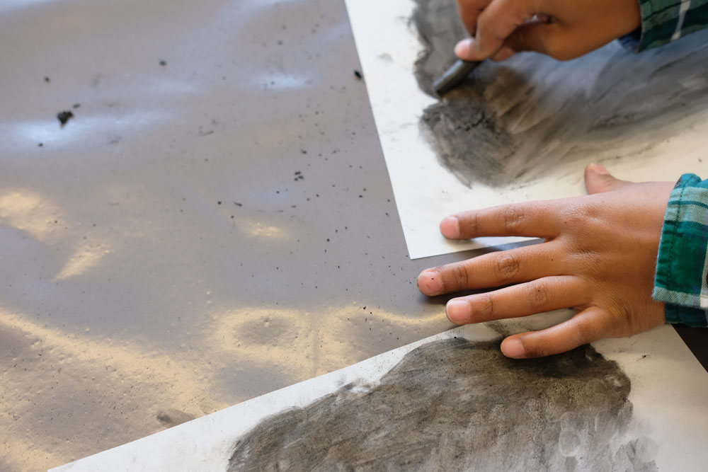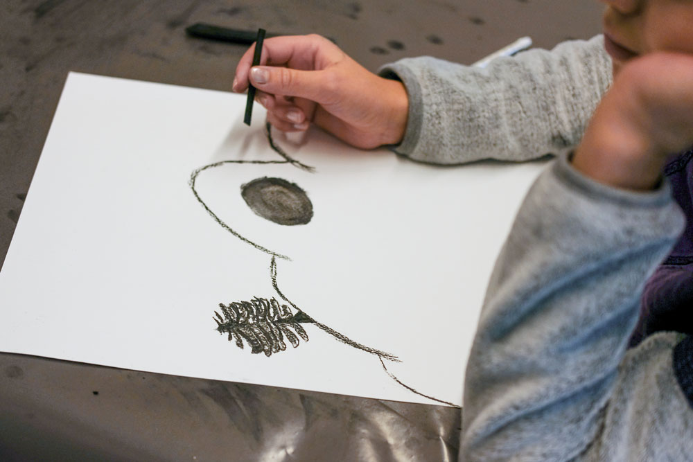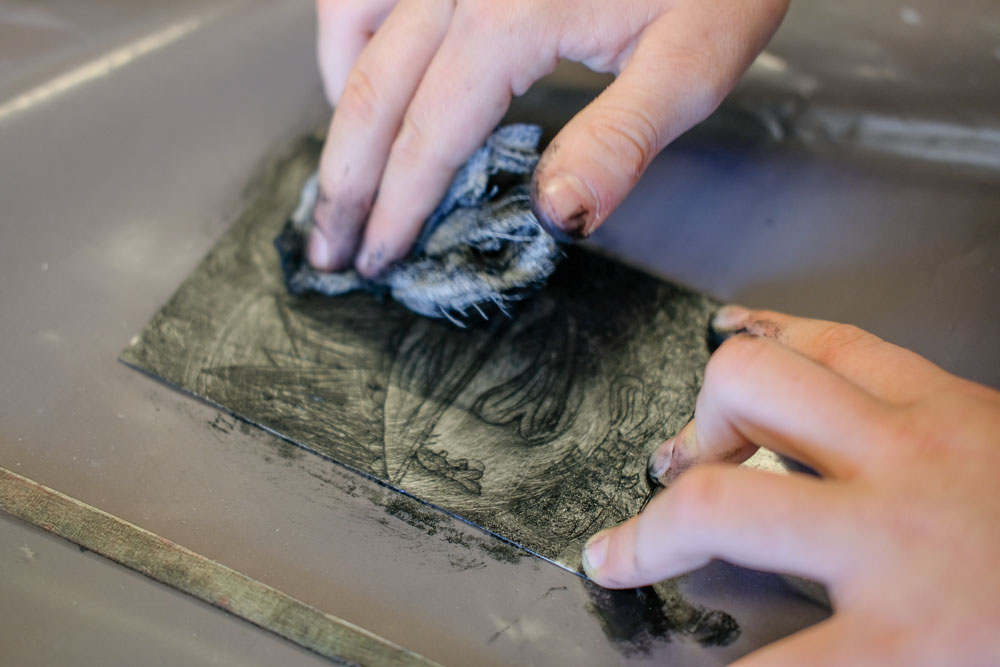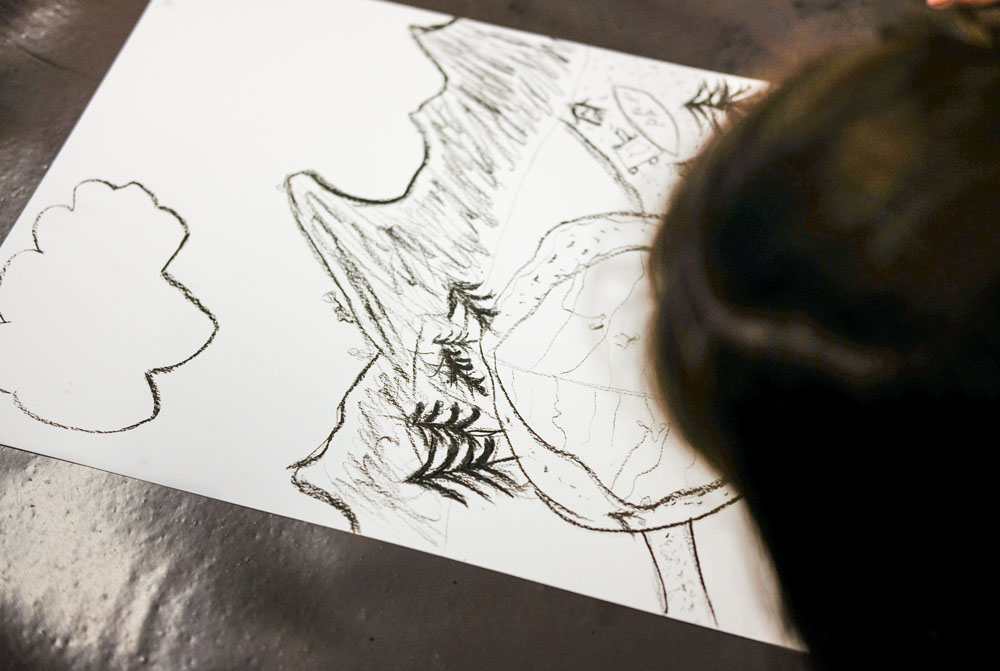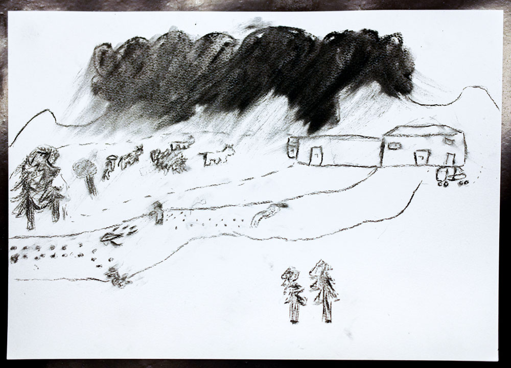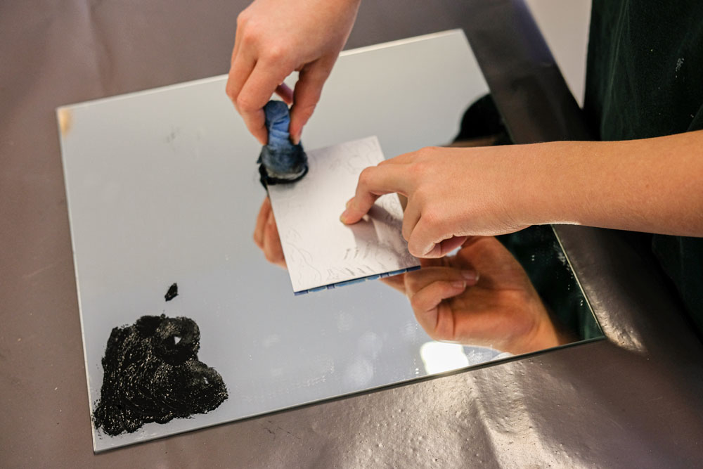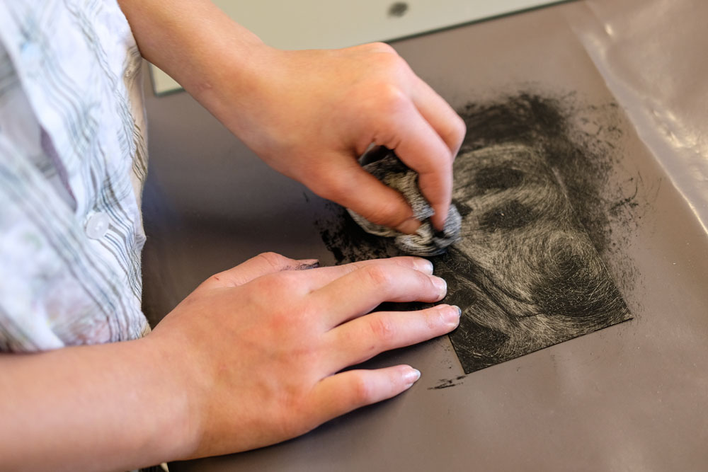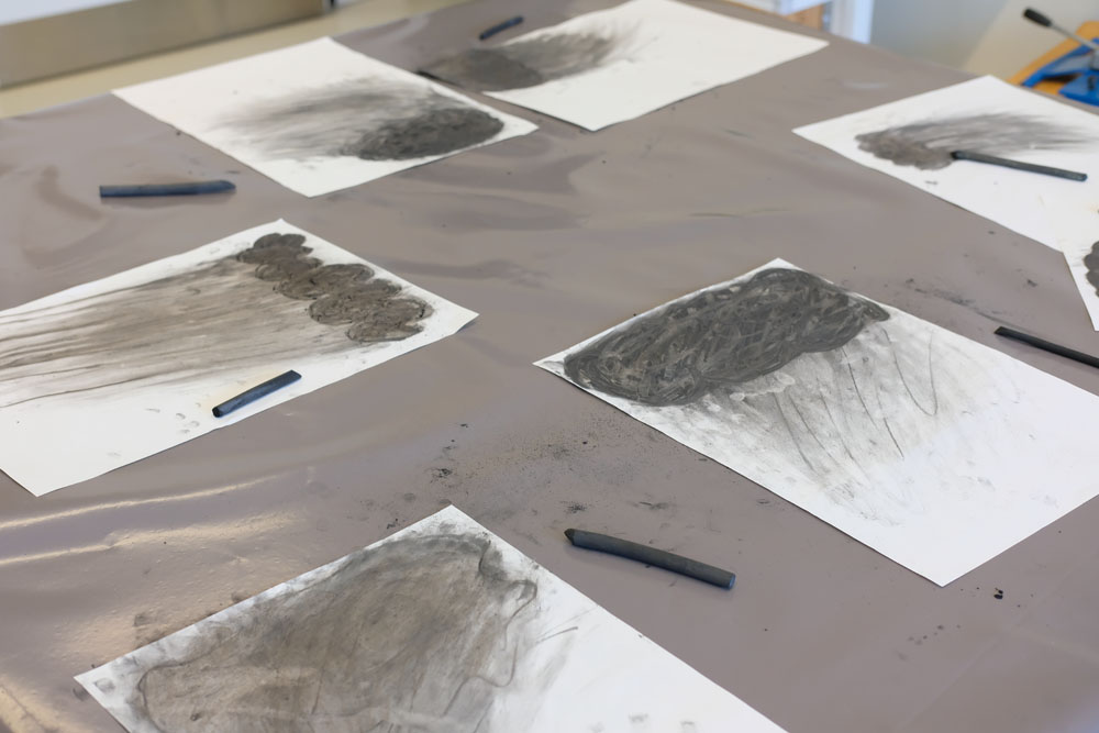 et les chapeaux s’envolent. Le paysage est en mouvement. C’est un excellent thème pour la gravure en creux sur du carton de brique de lait.