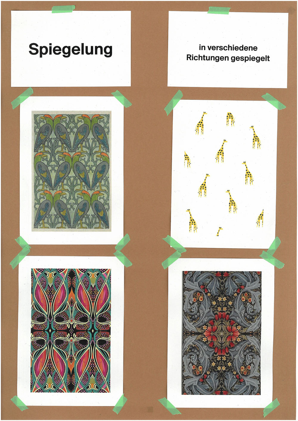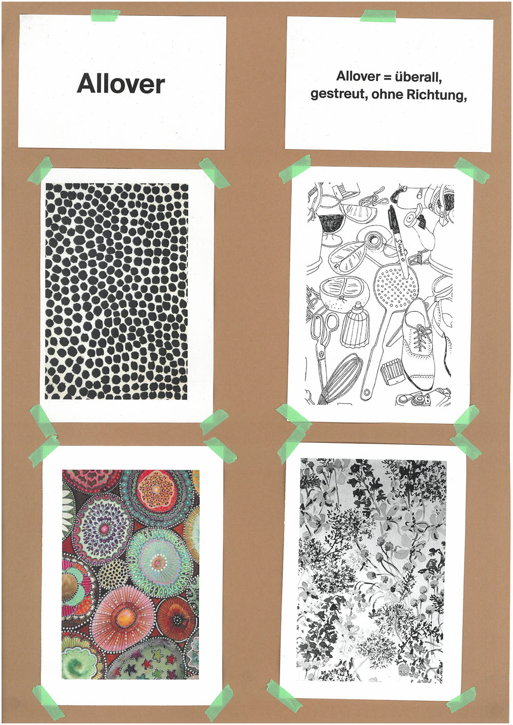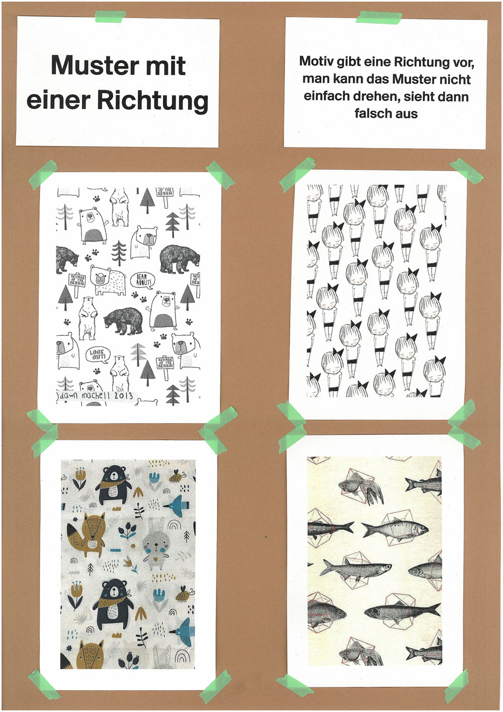 Partant de leurs propres intérêts, les élèves créent une planche d’inspiration (moodboard), dessinent des éléments graphiques et les réunissent dans une collection de motifs. Ils et elles se familiarisent avec le vocabulaire technique et les méthodes pour composer des motifs, et documentent leur processus de création. La séquence d’enseignement se concentre sur la découverte ludique d’éléments